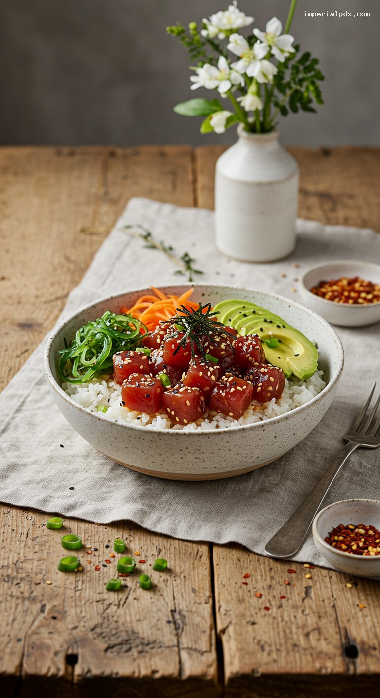 Taste a piece of tuna; adjust with an extra splash of shoyu or a pinch more chili flakes if needed. Serve right away while the rice is warm and the poke is cold for the classic hot-cold contrast.