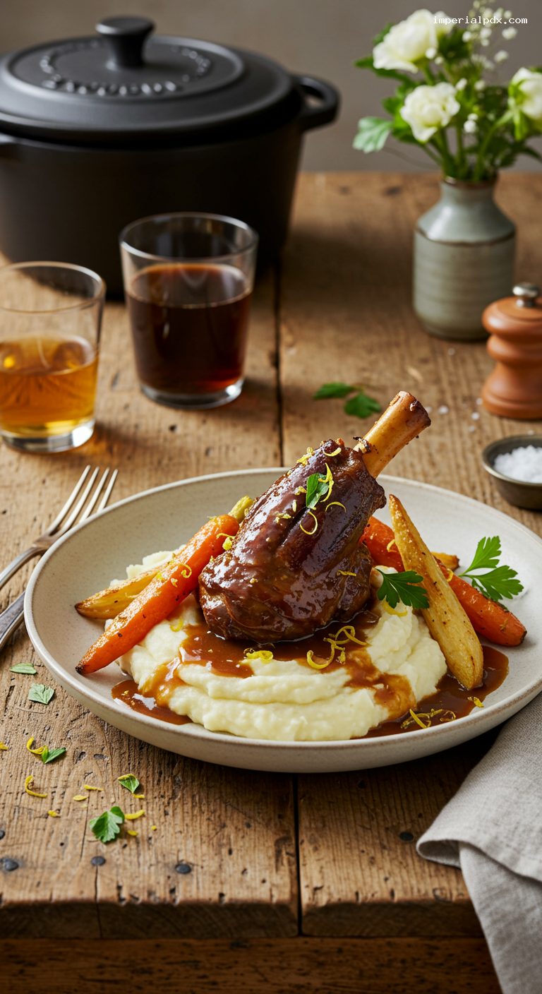 - 6. Reduce sauce on stovetop 5–10 minutes to glossy. Serve shanks and vegetables over cloud-soft mash; finish with mint–parsley sprinkle.
