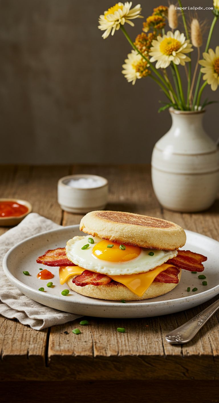 - Perfectly crispy bacon, a just-set fried egg, and melty American cheese in a toasty English muffin.