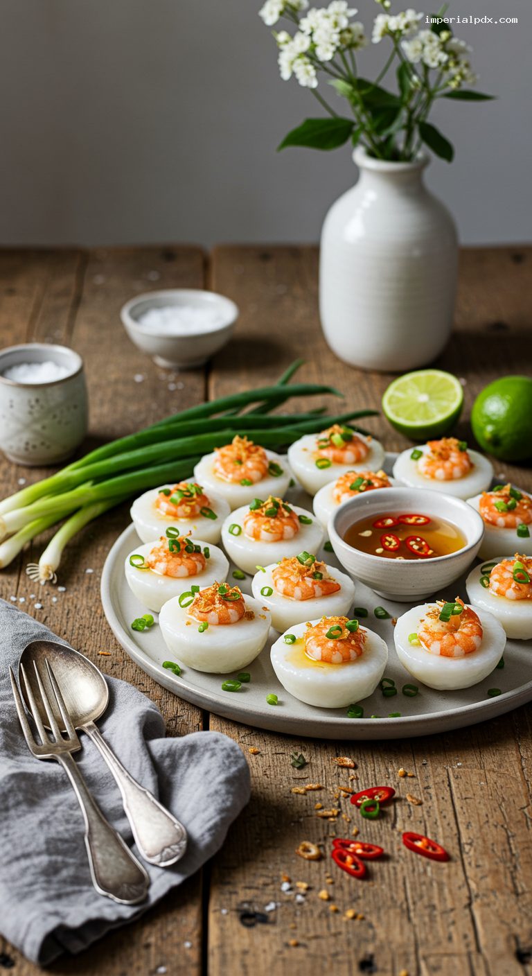 For the dipping sauce, dissolve sugar in warm water, then stir in fish sauce, lime juice, garlic, and chili. To serve, leave the cakes in their cups or unmold with a thin spatula. Top each cake with a spoonful of minced shrimp, drizzle 1/2–1 tsp scallion oil, and finish with a pinch of crispy shallots and a crack of pepper. Serve immediately with small bowls of the light nuoc cham.