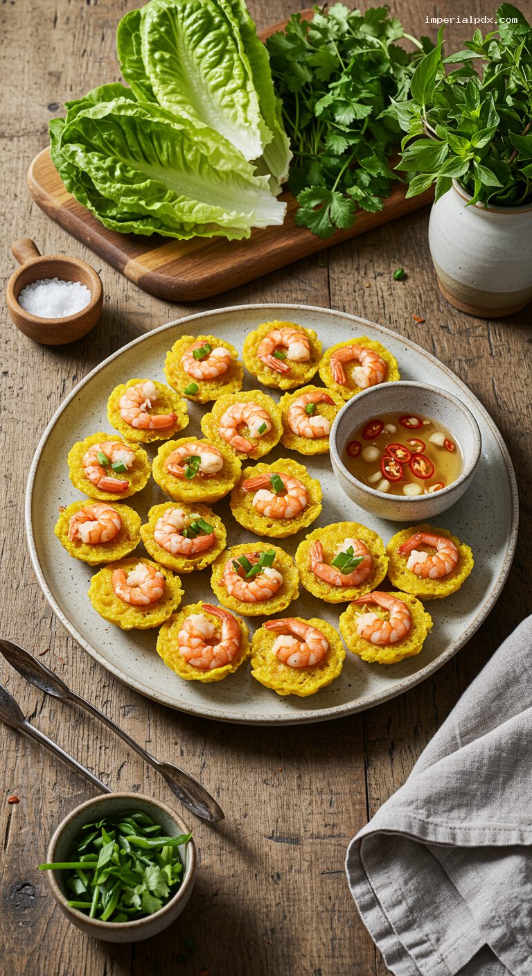 - Pantry: Small shrimp (12 oz), rice flour, cornstarch, baking powder, ground turmeric, unsweetened coconut milk (canned), fish sauce, sugar, neutral oil (canola/peanut), kosher salt