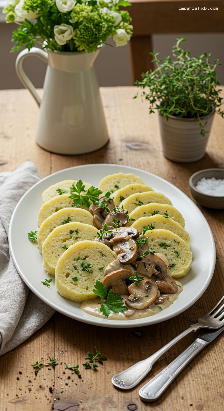 - Classic Bavarian comfort: pillowy bread dumpling slices with a velvety, thyme-laced mushroom cream.