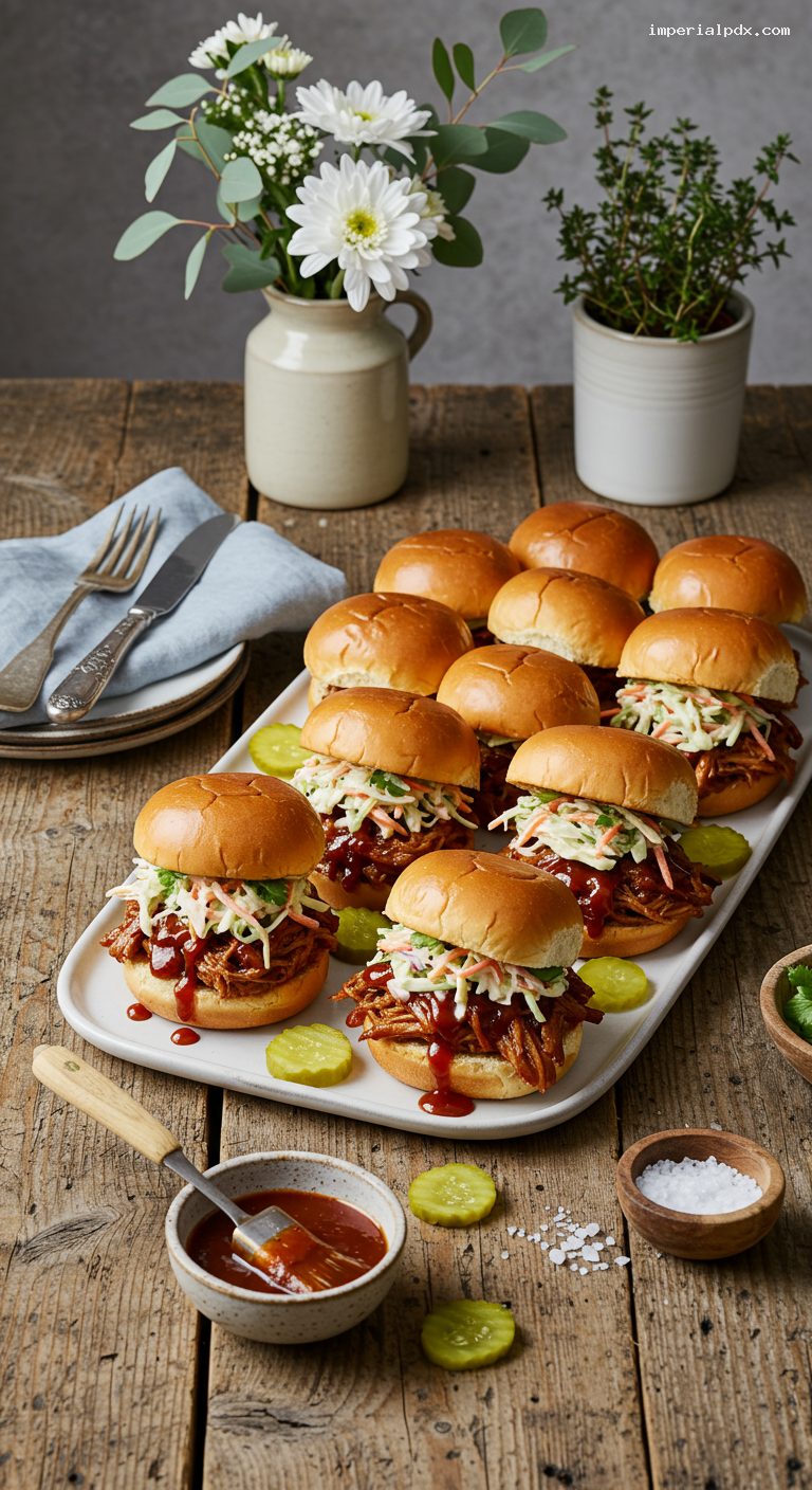 Layer about 1/4 cup of the saucy pulled pork on each roll. Brush or drizzle a little extra smoky barbecue sauce over the pork. Top with a generous spoonful of tangy slaw and 2–3 pickle chips. Cap with the top bun and serve immediately while warm and juicy.