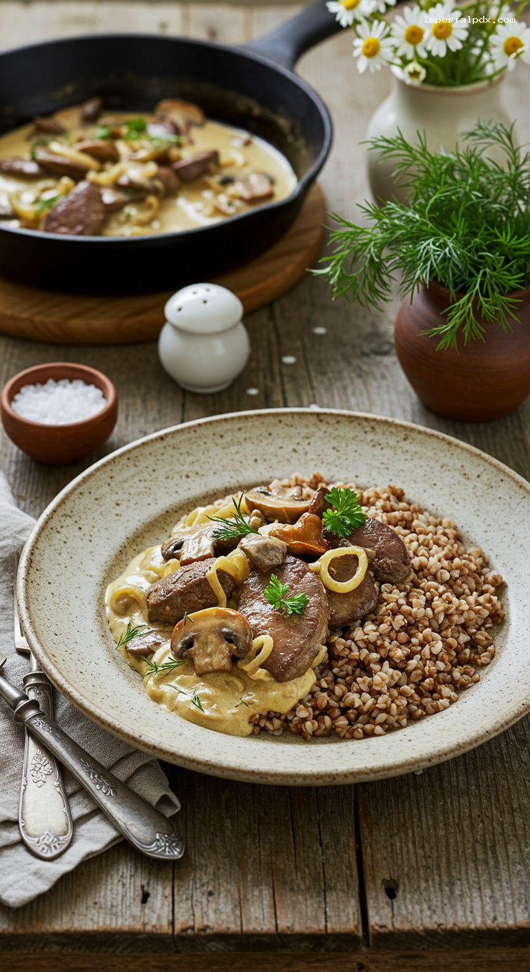 - Classic Russian comfort: velvety sour-cream–mustard sauce with tender strips of liver and mushrooms.