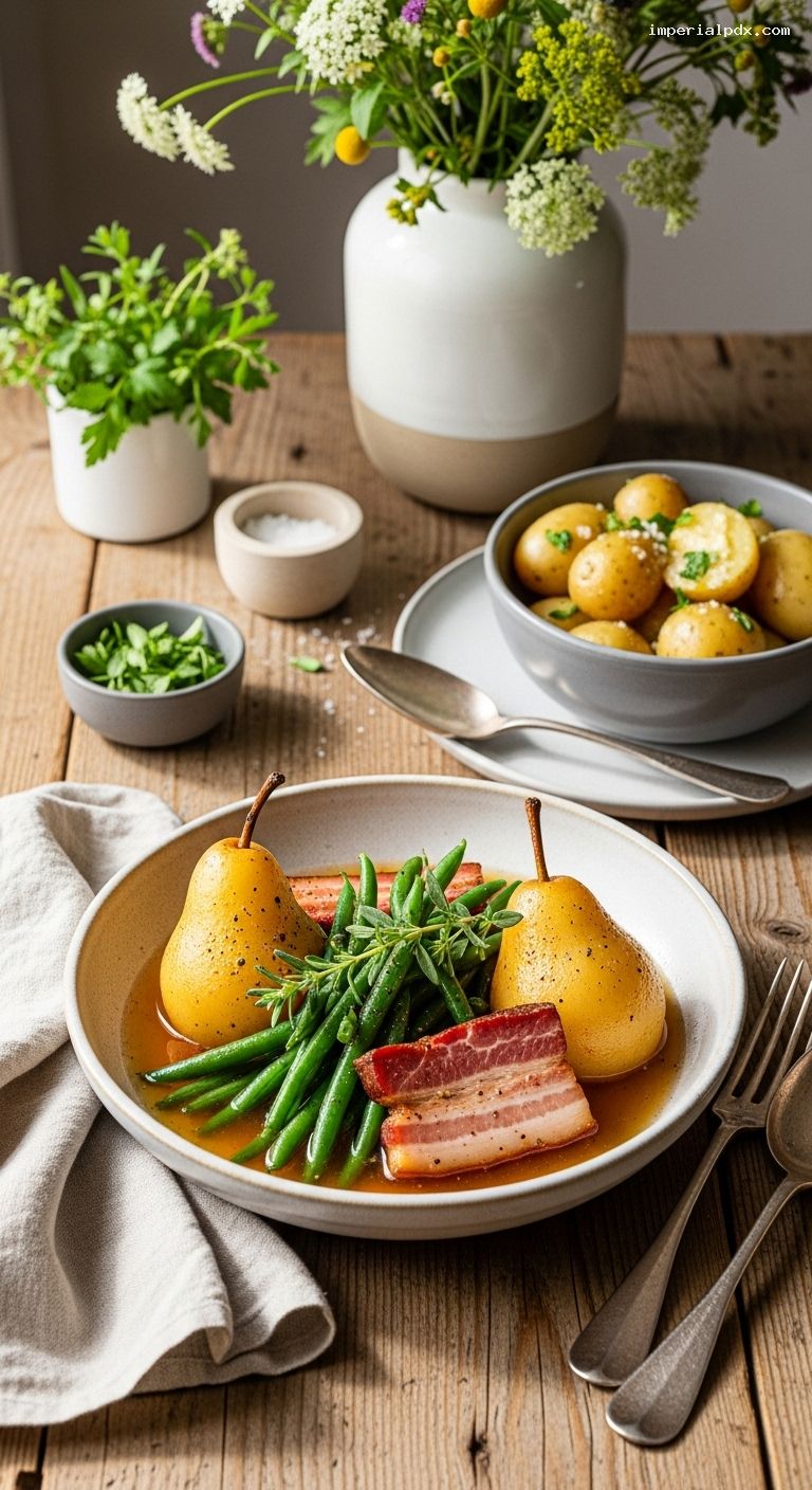 - Produce: Green beans, small firm pears, yellow onion, waxy potatoes, fresh summer savory (or dried), fresh parsley (optional)