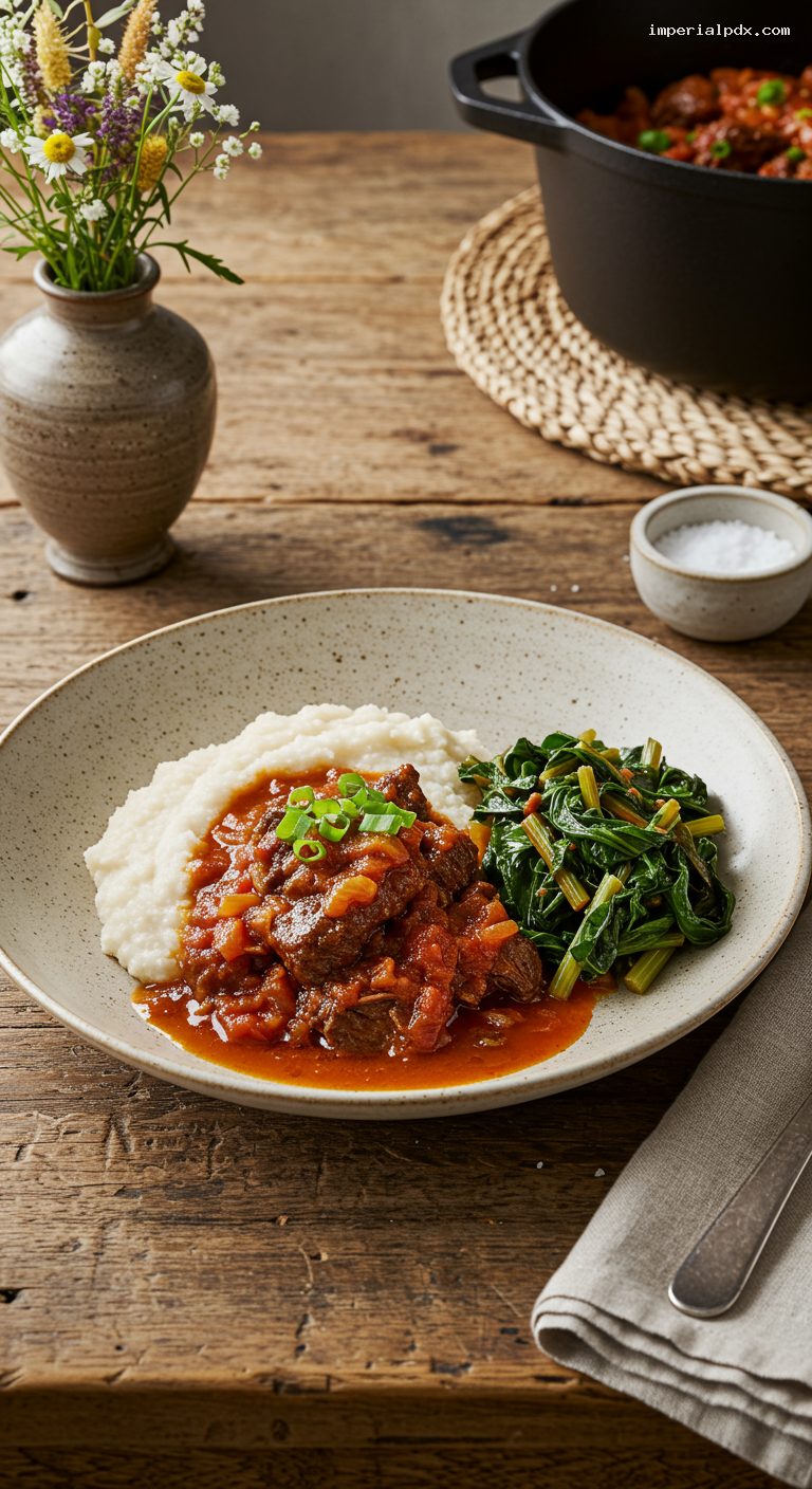 - Comforting, balanced plate: stiff pap for substance, bright tomato–onion gravy, and earthy sautéed greens.