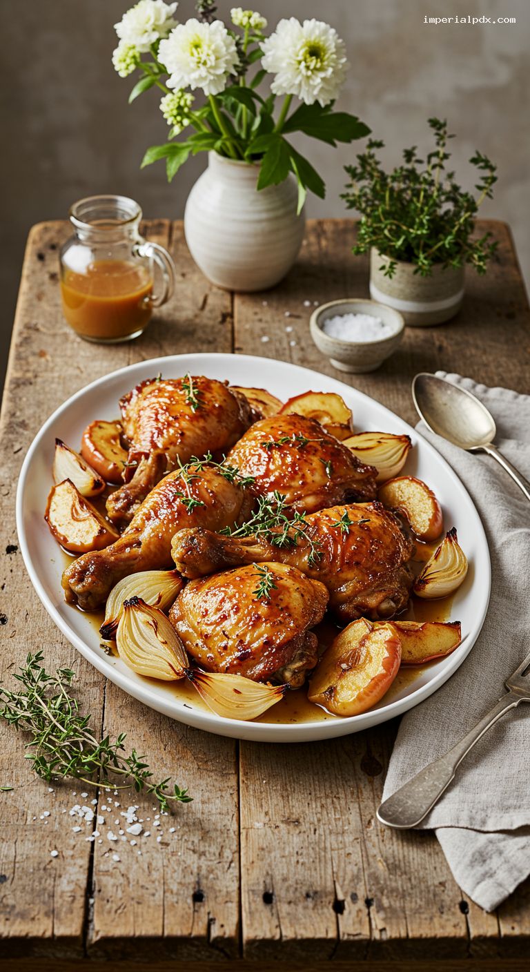 Transfer chicken to a warm platter and rest 5–10 minutes. Toss the roasted apples and onions with the pan juices and scrape up any sticky browned bits. Spoon the mixture around the chicken. Finish with fresh thyme sprigs and a pinch of flaky salt. Serve immediately, spooning extra juices over each piece.