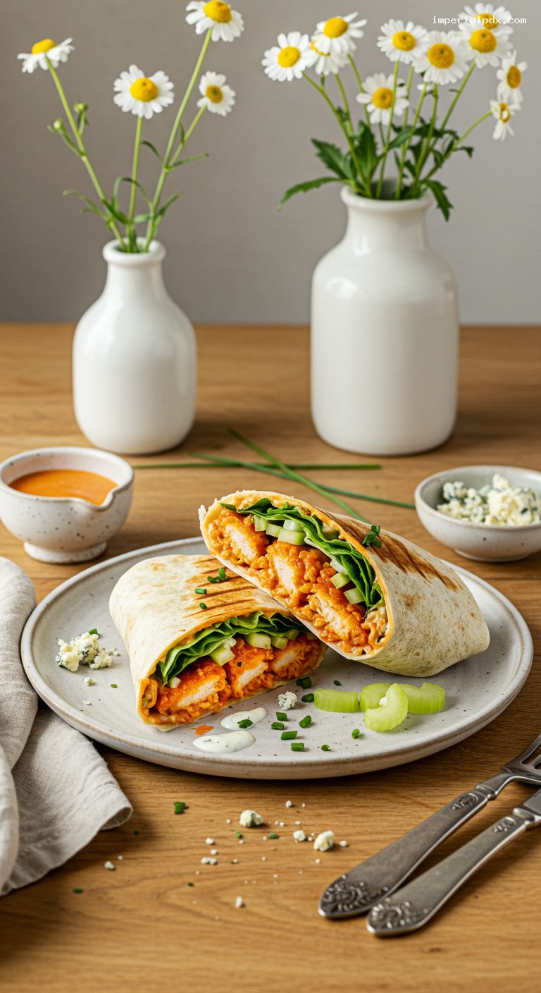 Fold the sides over the filling, then roll tightly from the bottom to form a burrito-style wrap. For a warm, lightly crisped exterior, place seam-side down in a dry skillet over medium heat for 30–60 seconds per side. Slice in half, drizzle with the reserved Buffalo sauce, and serve immediately.