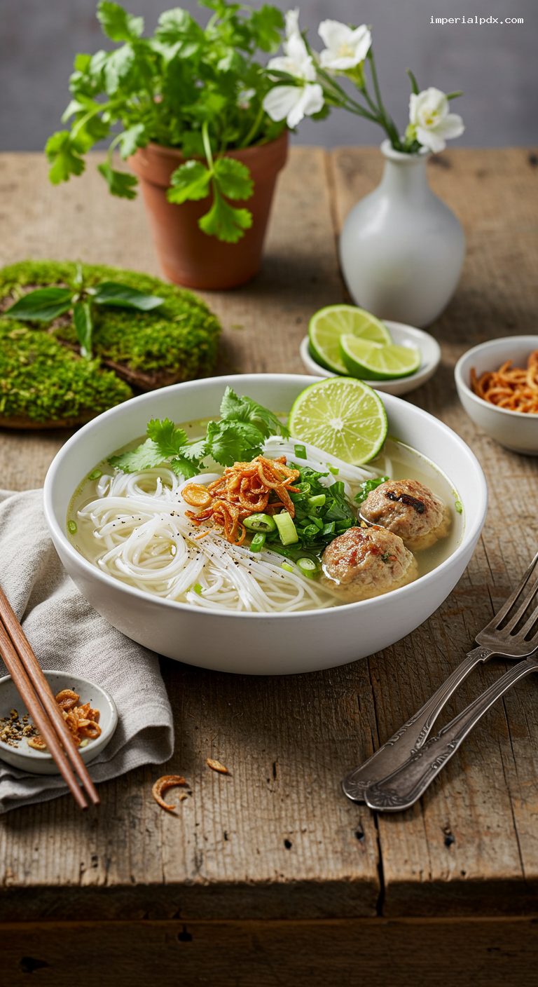- 6. Boil vermicelli 3–5 min; rinse. Portion noodles, add meatballs and hot broth. Top with scallions, cilantro, fried shallots; finish with lime and pepper.