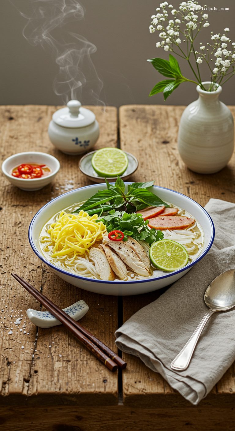 - Vegetarian: Use a light vegetable-kombu broth, replace giò lụa with pressed tofu matchsticks, and keep the egg ribbons (or omit for vegan).