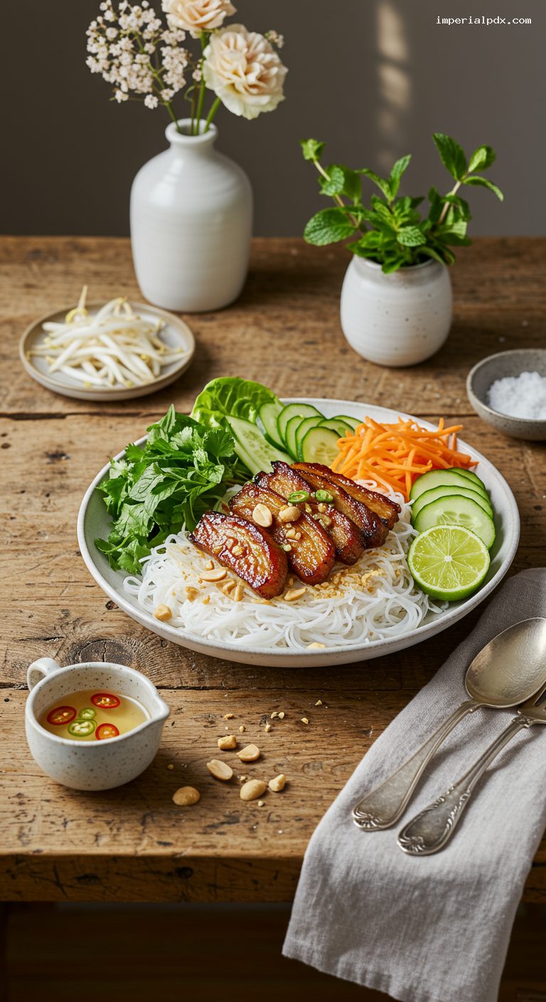 Divide noodles among 4 bowls. Top each with a generous handful of shredded lettuce, cucumber slices, and a mix of herbs. Add a small pile of drained pickled carrot/daikon. Spoon warm grilled pork over the top and sprinkle with chopped peanuts. Serve with nuoc cham on the side or drizzle 2–3 tablespoons over each bowl. Add lime wedges for extra brightness.