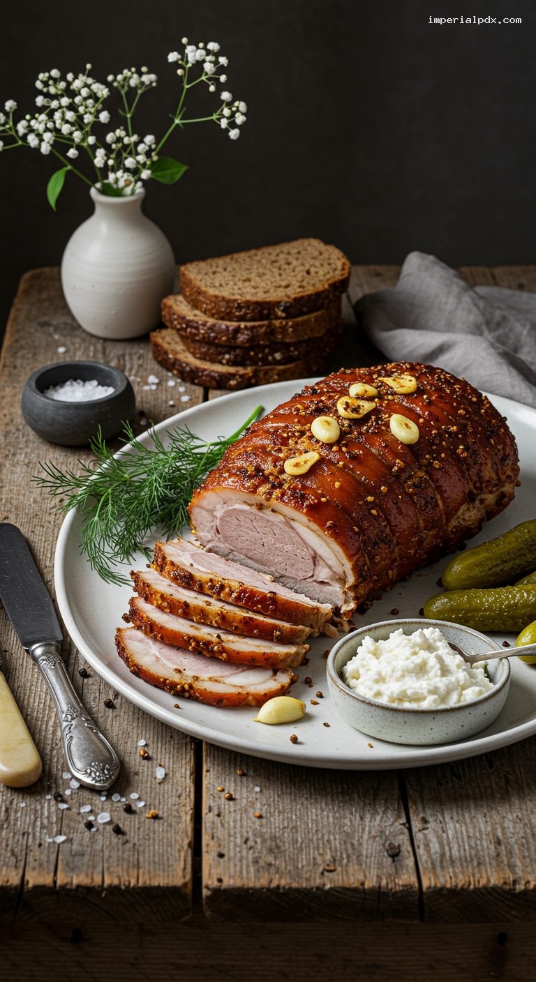Unwrap and blot any surface moisture. Slice thinly (2–3 mm) across the grain. Arrange on a platter with dark rye bread, a bowl of sharp horseradish, and dill pickles. Garnish with dill sprigs if you like. Serve cold; that’s the classic buzhenina experience.