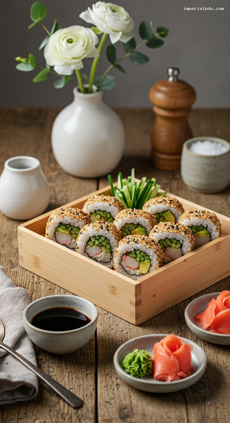 - Pantry: Sushi rice, nori sheets, rice vinegar, sugar, fine salt, toasted sesame seeds, imitation crab sticks, soy sauce, wasabi paste, pickled ginger, optional Japanese mayonnaise