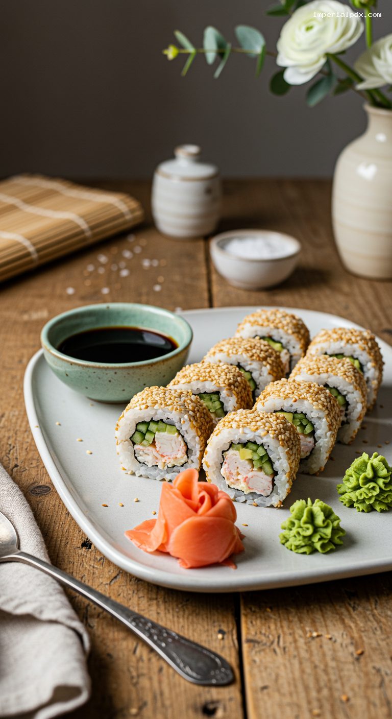 - Pantry: Sushi rice, nori sheets, rice vinegar, sugar, fine sea salt, sesame seeds, soy sauce, wasabi paste, pickled ginger, Japanese mayonnaise (Kewpie) or regular mayo, optional tamari (gluten-free)