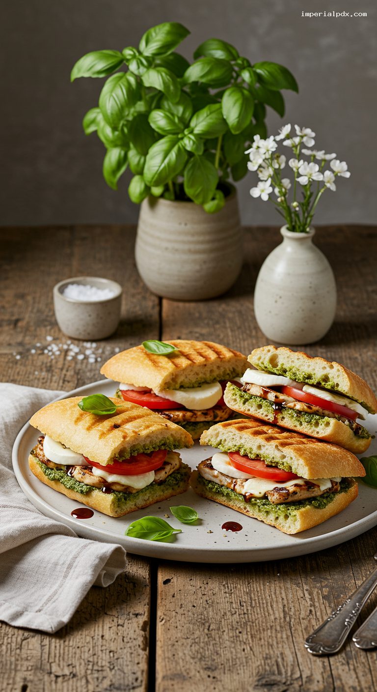 - 5. Spread pesto on bread; layer mozzarella, tomato, sliced chicken, and basil.