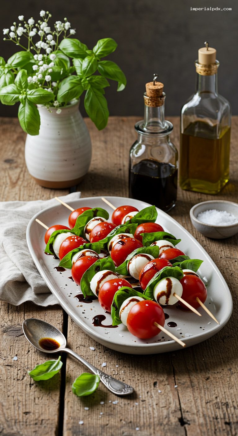 When the balsamic glaze is warm and pourable (not hot), drizzle it in thin zigzags over the skewers. Aim for about 1–1 1/2 teaspoons glaze per 4 skewers so every bite gets sweet-tart flavor without pooling on the platter.