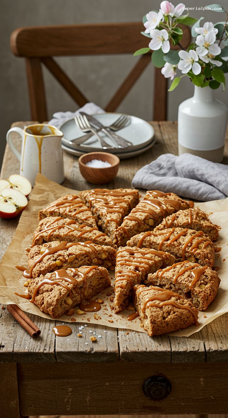 Store scones airtight at room temperature for up to 2 days, or refrigerate up to 4 days. Rewarm at 300°F (150°C) for 8–10 minutes. Freeze baked scones (undrizzled) up to 2 months; thaw and reheat, then drizzle with warmed caramel. To freeze unbaked: shape and score the slab, freeze until firm, wrap well, and bake from frozen at 400°F (205°C) for 22–25 minutes. Quick caramel keeps refrigerated up to 1 week; rewarm gently, adding a teaspoon of cream if needed.