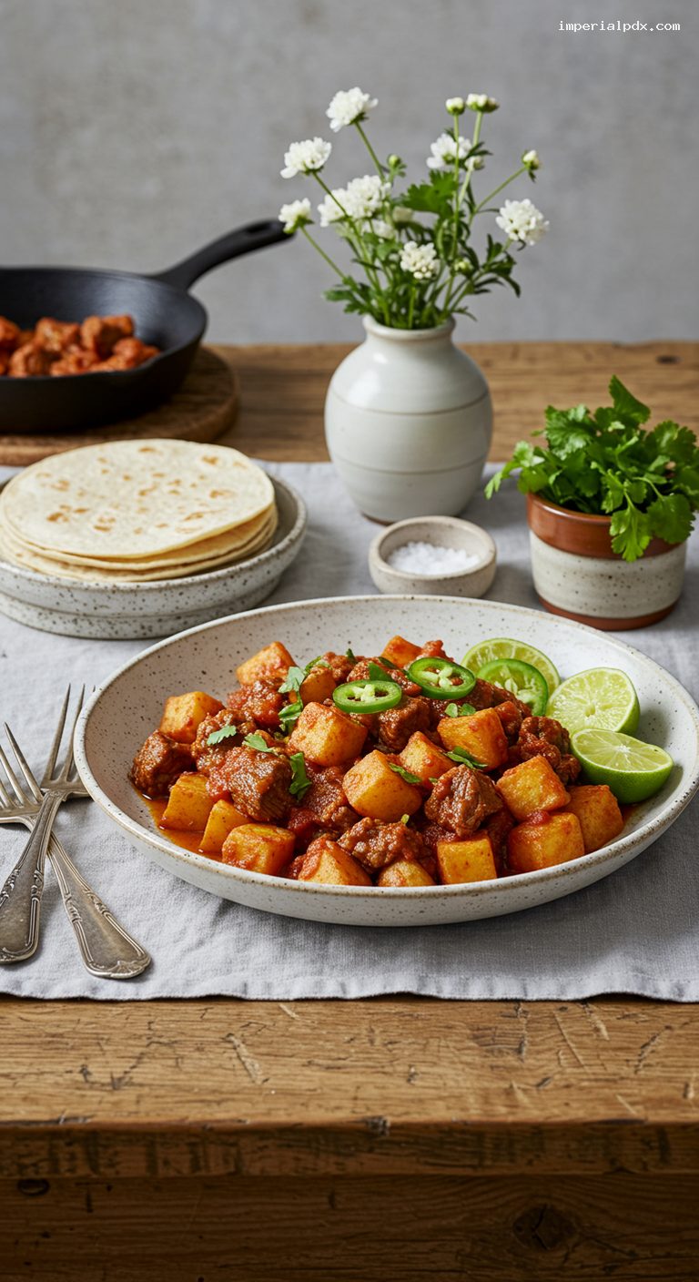 - One-pan comfort: juicy, finely chopped beef and tender potatoes in a tomato-cumin gravy.
