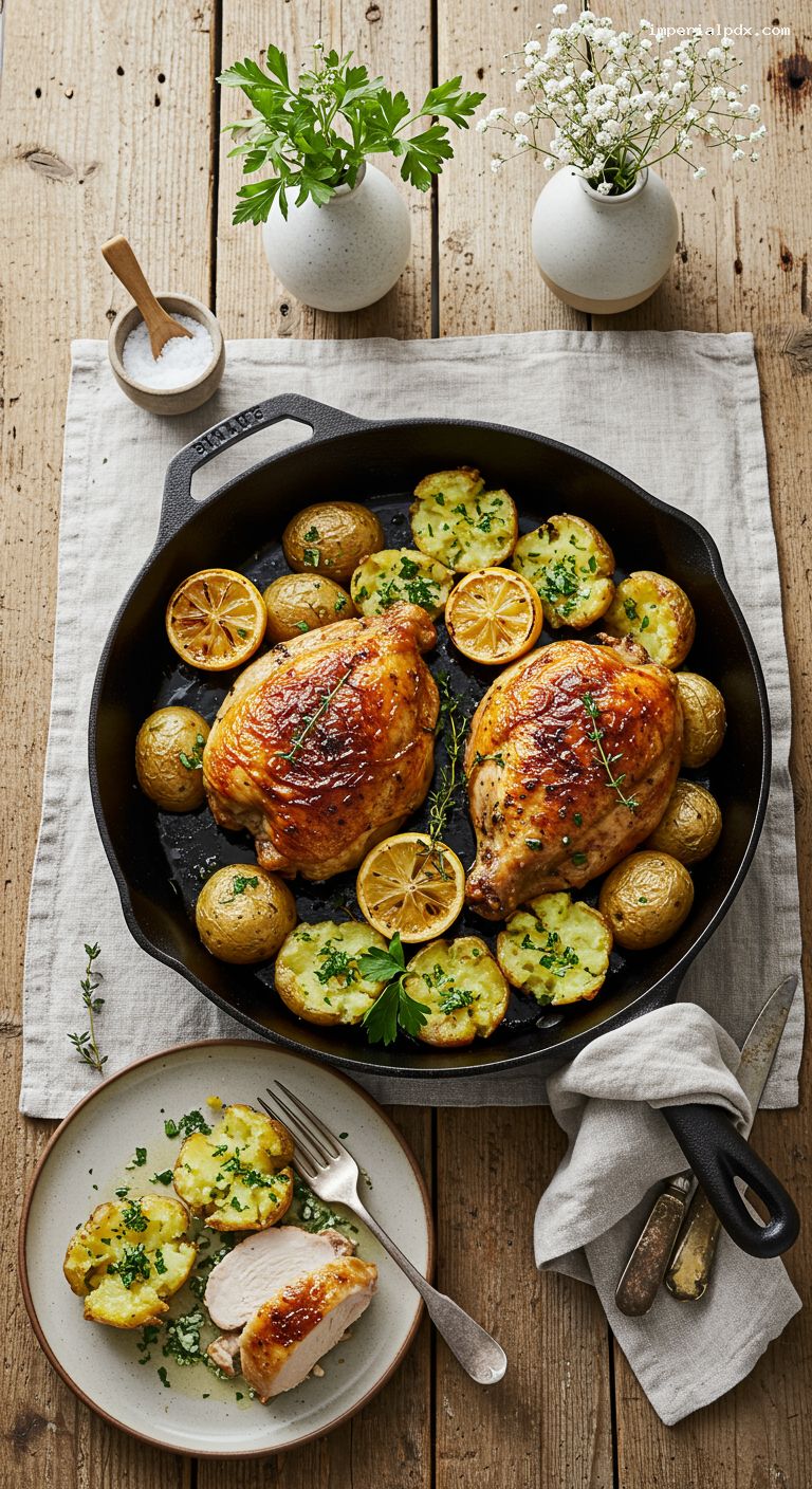 - 4. Smash potatoes gently; lay lemon slices and thyme in skillet. Arrange potatoes in a snug single layer; set chicken skin-side up on top.