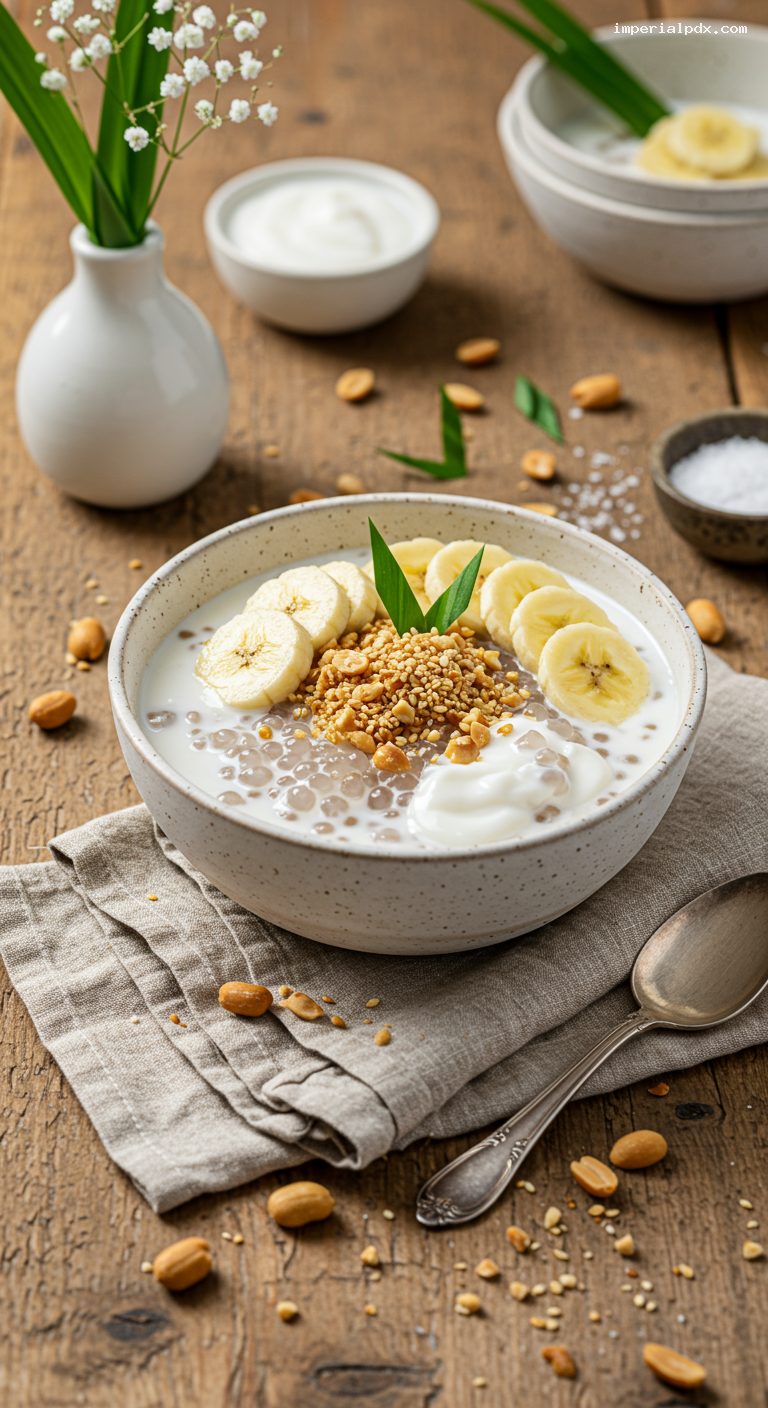 - Creamy, coconut-rich dessert with tender bananas and silky tapioca pearls.
