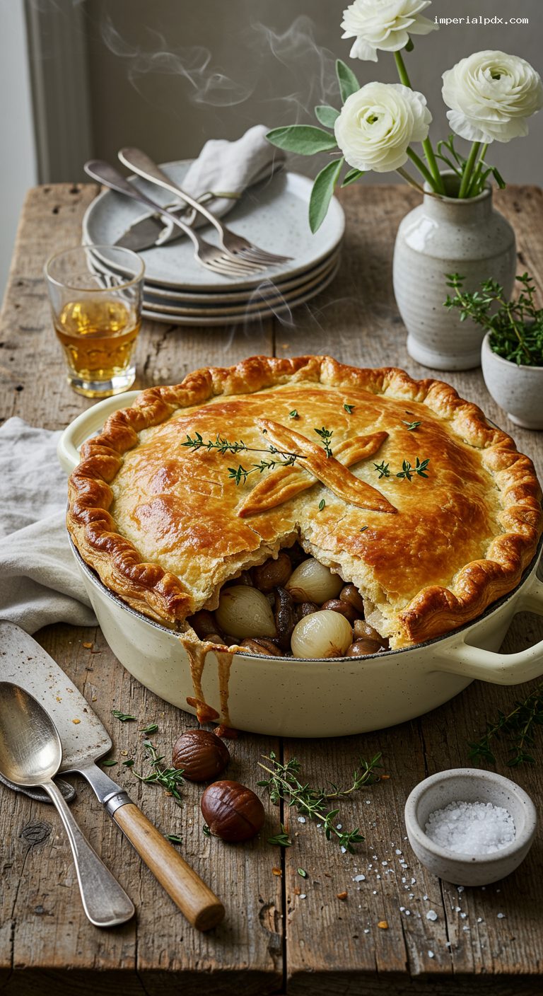 - 6) Transfer to a 2-quart baking dish. Top with pastry, crimp, egg-wash, and vent. Bake 25–30 minutes until deep golden. Rest 10 minutes; garnish with parsley.