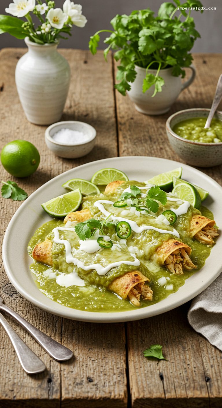 Make the salsa verde up to 4 days ahead (refrigerated) or 3 months (frozen). Poach and shred chicken up to 3 days ahead. Assemble unbaked enchiladas (without crema) up to 24 hours in advance; cover and refrigerate. Bake chilled at 375°F for 20–25 minutes, until hot. To freeze: assemble without crema, wrap tightly, and freeze up to 2 months. Bake from frozen, covered, at 375°F for 25 minutes, then uncover and bake 15–20 minutes more; broil to brown if desired.