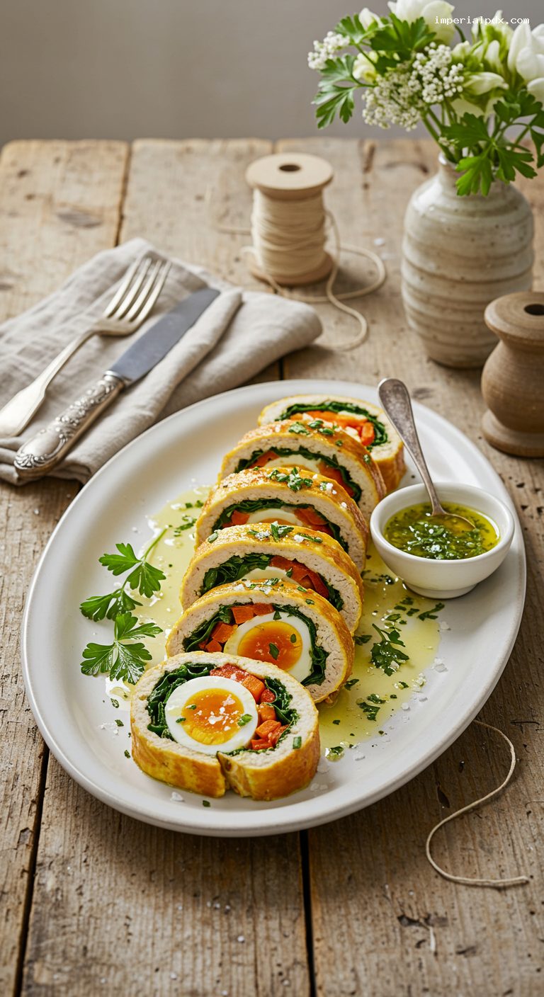 Assemble up to 24 hours ahead and keep tightly wrapped in the fridge. After cooking, the roulade keeps 3–4 days refrigerated. For best slices, chill fully before cutting. To freeze, wrap the whole cooked roulade or individual slices tightly and freeze up to 2 months (note that egg texture firms slightly when frozen). Thaw overnight in the refrigerator. Serve chilled or gently rewarm slices by steaming 3–4 minutes or in a 300°F (150°C) oven for 8–10 minutes.
