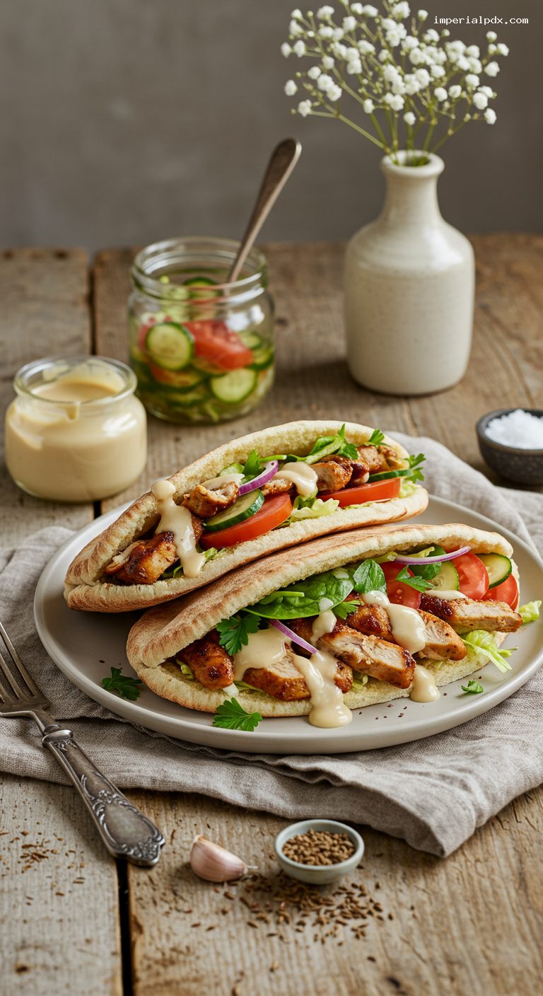 Marinate chicken up to 24 hours ahead. The tahini sauce keeps 5–7 days refrigerated; stir and thin with water as needed. Quick pickles keep 1 week in the fridge. Cooked chicken stores 3–4 days refrigerated or up to 2 months frozen; reheat gently in a skillet with a splash of water to keep it tender. Warm pitas just before serving for best texture.