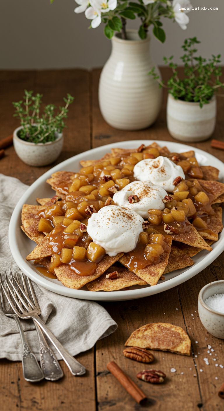 Arrange the cinnamon-sugar chips on a large platter. Spoon the warm apple compote all over, drizzle generously with warm caramel, and finish with dollops of whipped cream. Sprinkle with toasted nuts and a pinch of flaky salt if you like. Serve right away while the chips are crisp and the toppings are warm.