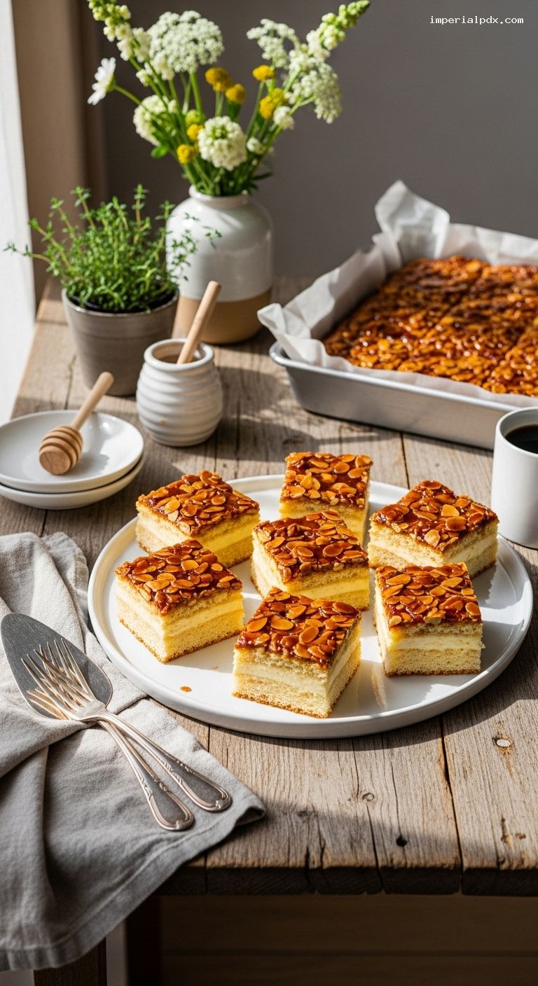 - Classic German bakery flavor: tender yeasted cake, glossy almond-honey crust, and silky vanilla cream.