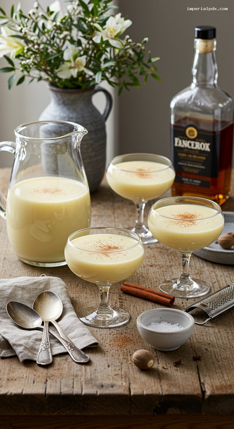 Stir the eggnog before pouring. Serve well-chilled in small cups, mugs, or coupes. Garnish each glass with a light snowfall of freshly grated nutmeg and a cinnamon stick. For a lighter texture, you can briefly whisk or shake before serving to add a touch of froth.
