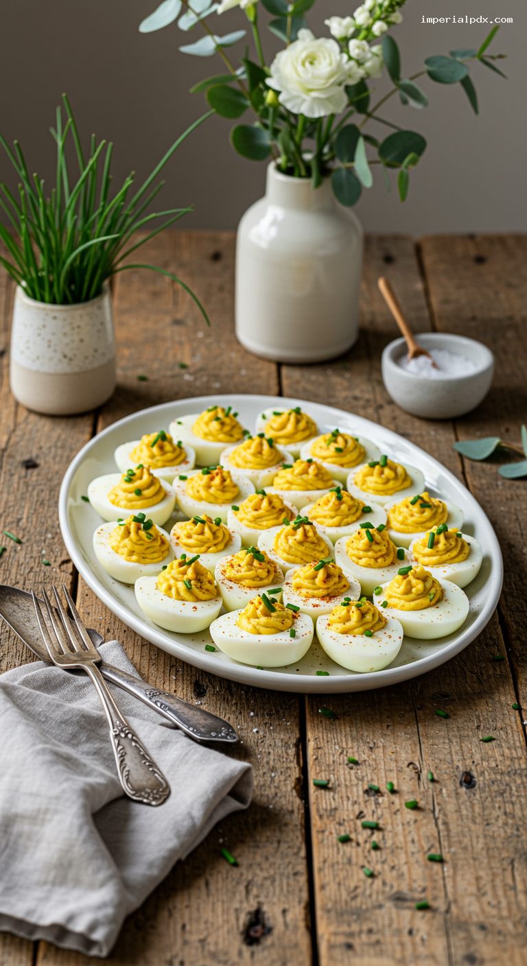 Dust lightly with smoked paprika and sprinkle with snipped chives. Chill for 15–20 minutes to set the filling and marry flavors. Serve cool; keep refrigerated at or below 40°F.