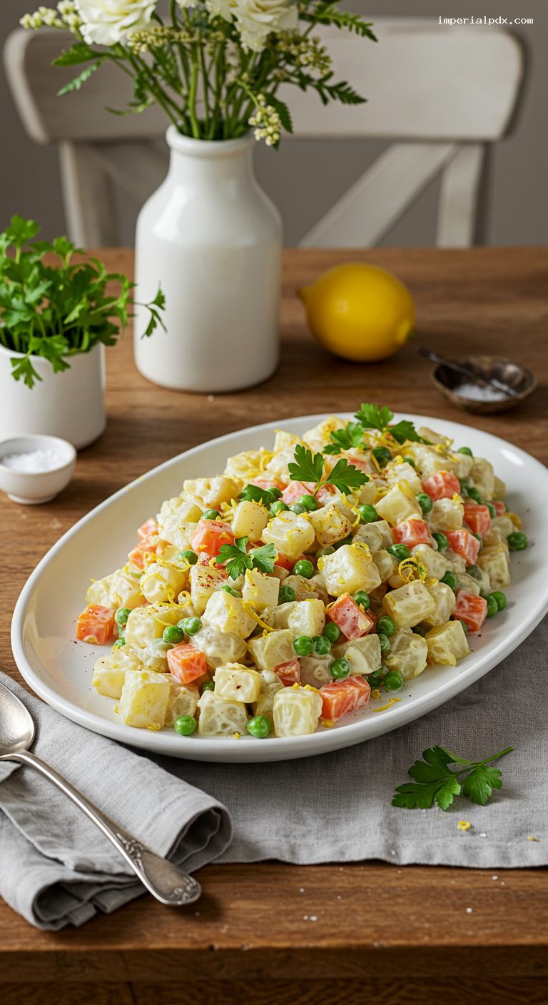 Transfer to a serving bowl, smooth the top, and swirl lightly for a classic look. Cover and chill 1–4 hours at or below 40°F (4°C) so flavors meld and the salad firms up. Just before serving, refresh with the reserved dressing if needed and finish with a tiny pinch of paprika and a whisper of lemon zest.