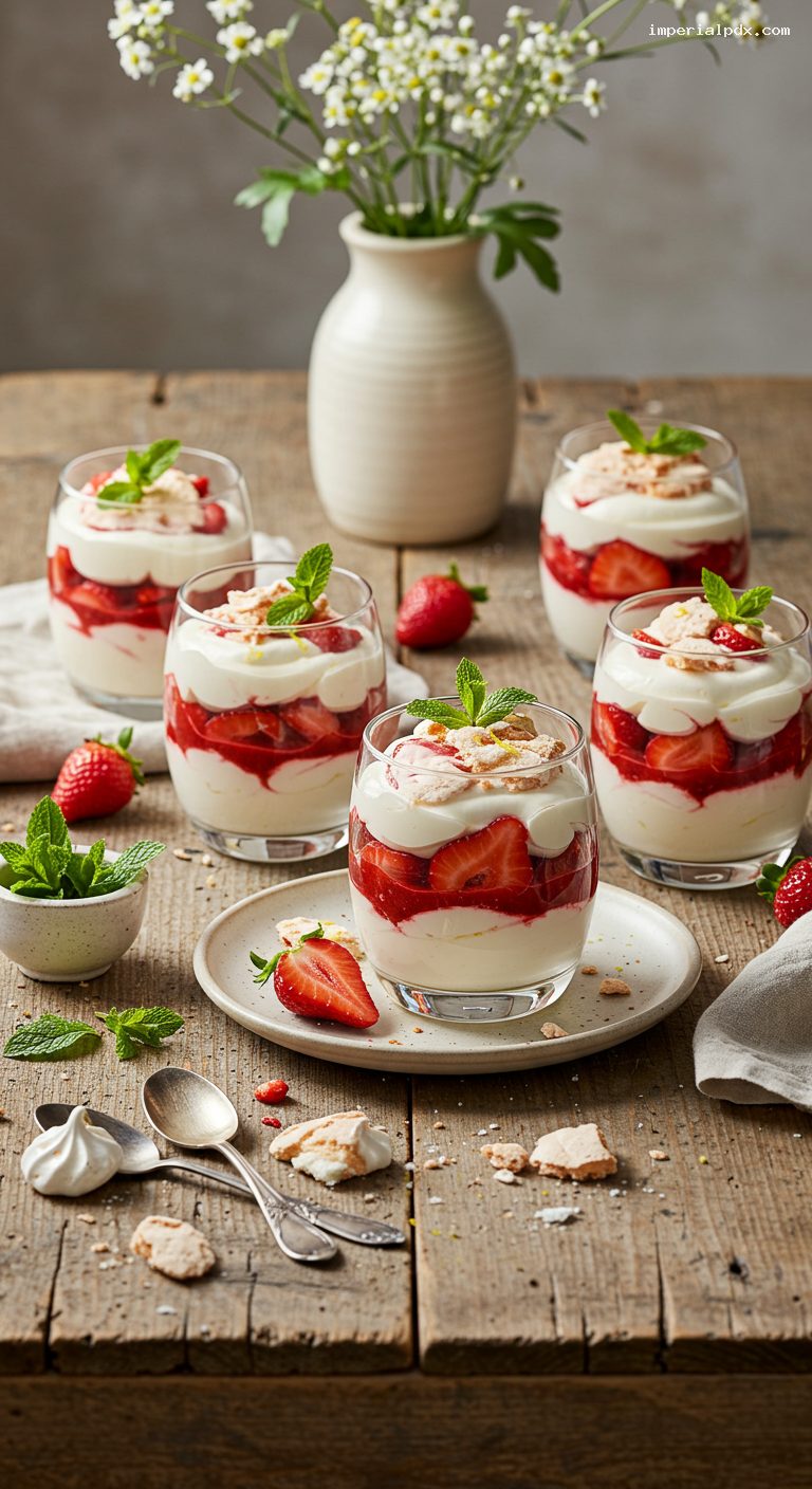 - 6. Serve: Spoon into glasses, top with remaining berries and meringue, drizzle more coulis, and garnish. Serve right away.