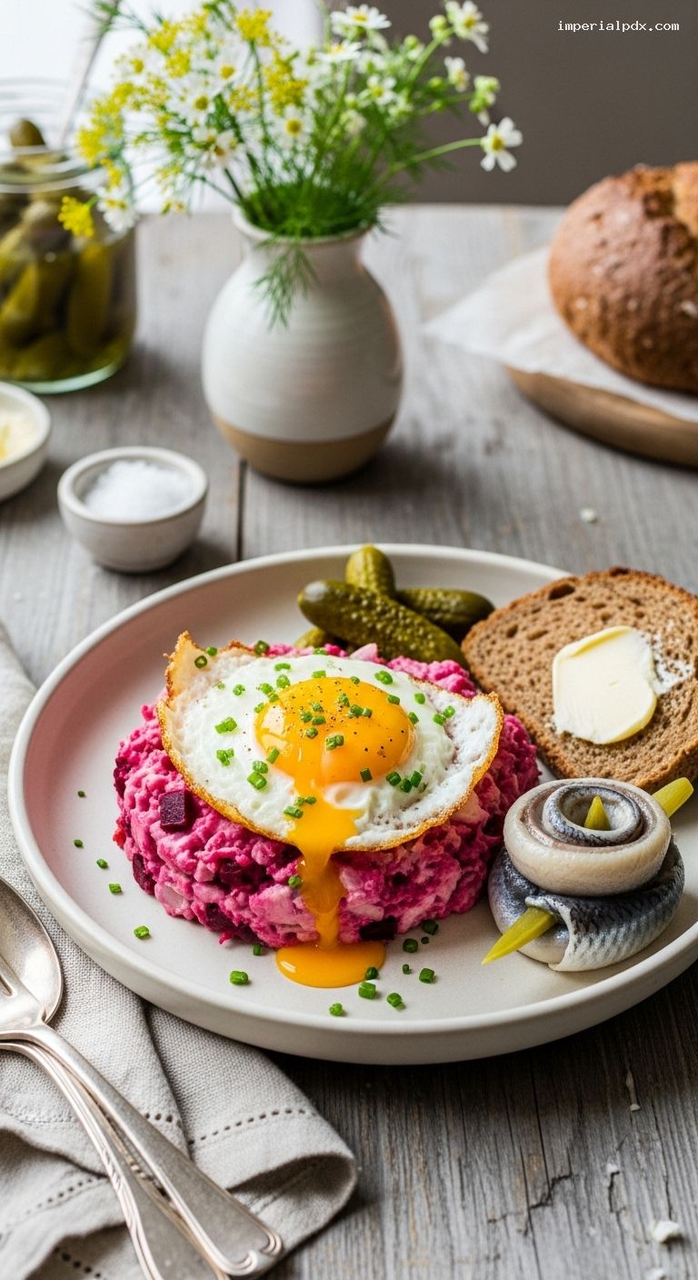 Spoon a generous mound of the corned beef–potato–beet mash onto warm plates. Top each portion with a fried egg. Arrange a rollmops and a few gherkins on the side. Add a slice of rye bread and sprinkle chives or dill over the egg and mash. Serve immediately.