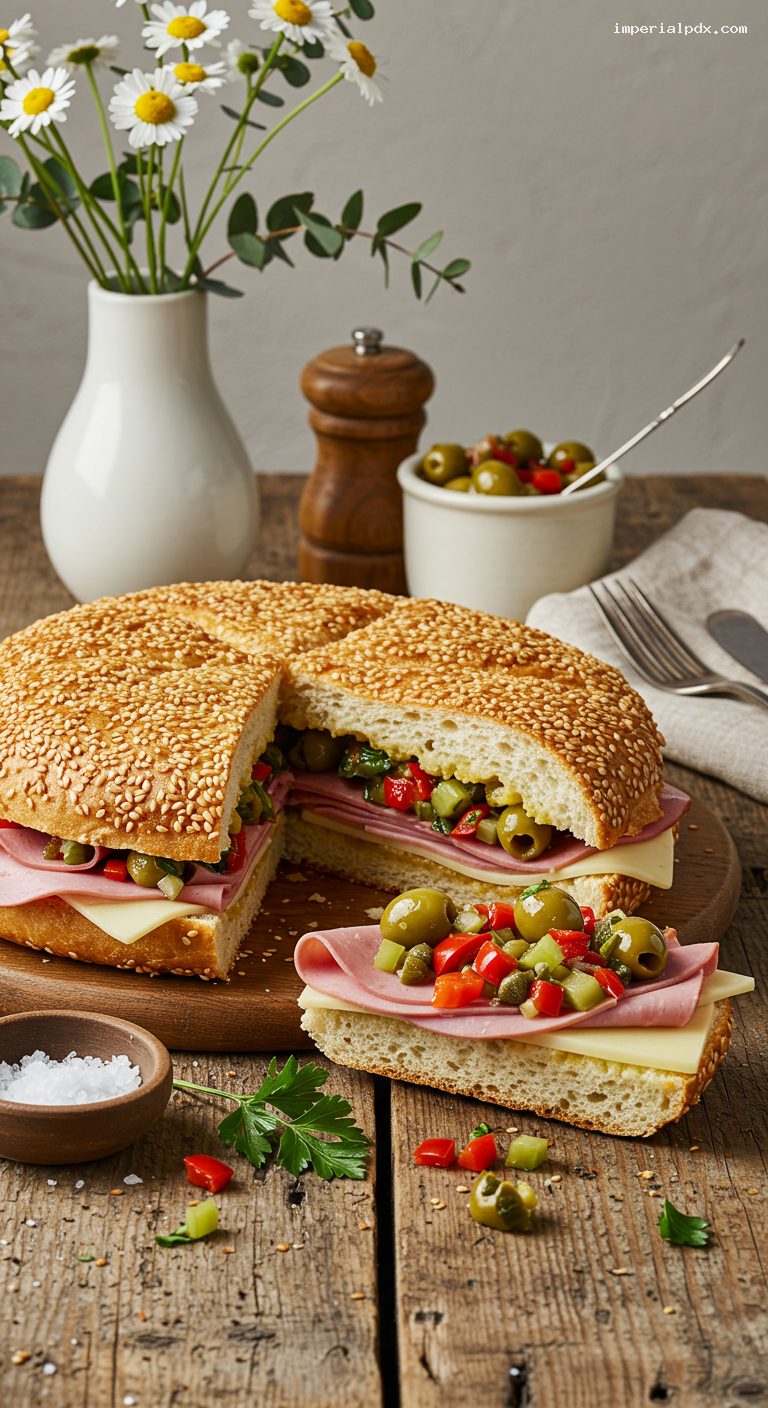 - Turkey & Swiss: Replace mortadella/salami/ham with 1 lb thin-sliced roasted turkey and swap provolone for Swiss; keep the olive salad as written.