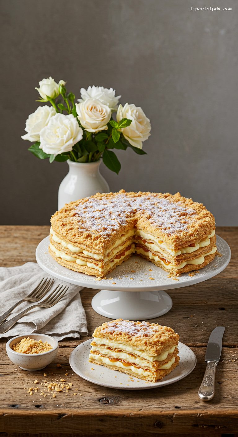 - Caramelized Top: Dust the top sheet with powdered sugar and briefly torch until glassy and amber for a mille-feuille–style crackle.