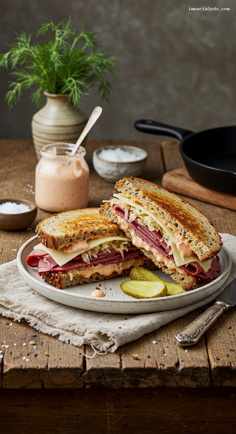 The dressing can be made up to 1 week ahead and refrigerated. Sauerkraut can be drained and patted dry 1 day ahead. Assemble and cook Reubens just before serving for best texture. Leftovers keep 1 day refrigerated; re-crisp in a skillet over medium-low heat 3–4 minutes per side or in a 350°F (175°C) oven for 8–10 minutes. Avoid microwaving, which softens the bread.