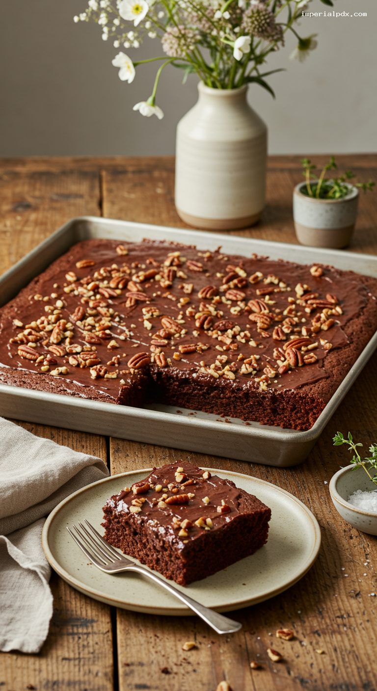 - 6) Icing: Simmer butter (1/2 cup), cocoa (1/4 cup), and buttermilk (6 tbsp). Off heat, whisk in vanilla, powdered sugar, then pecans.