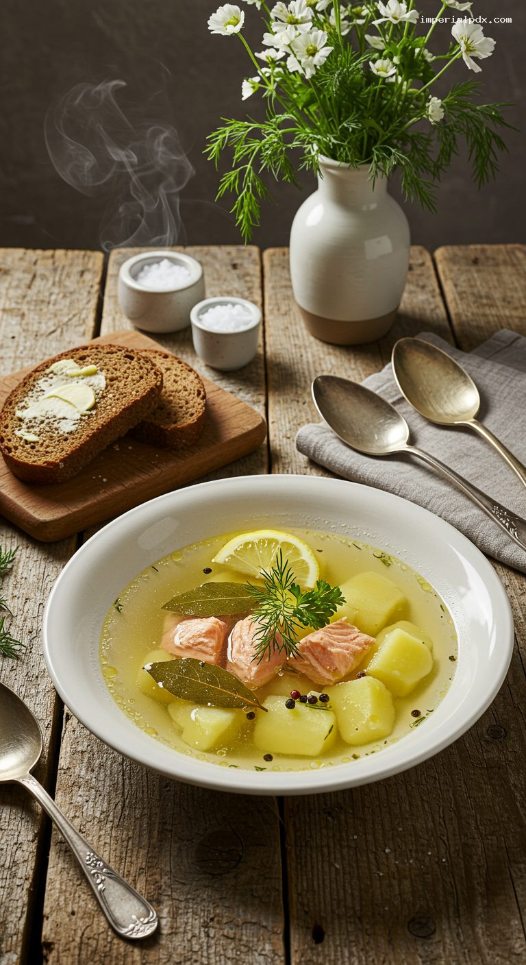 Warm the rye bread (optional: toast at 180°C/350°F for 5 minutes). Ladle the ukha into warm bowls, making sure each serving gets fish and potatoes. Garnish with a bit more dill and offer lemon wedges on the side. Serve immediately with the warm rye bread and soft butter.