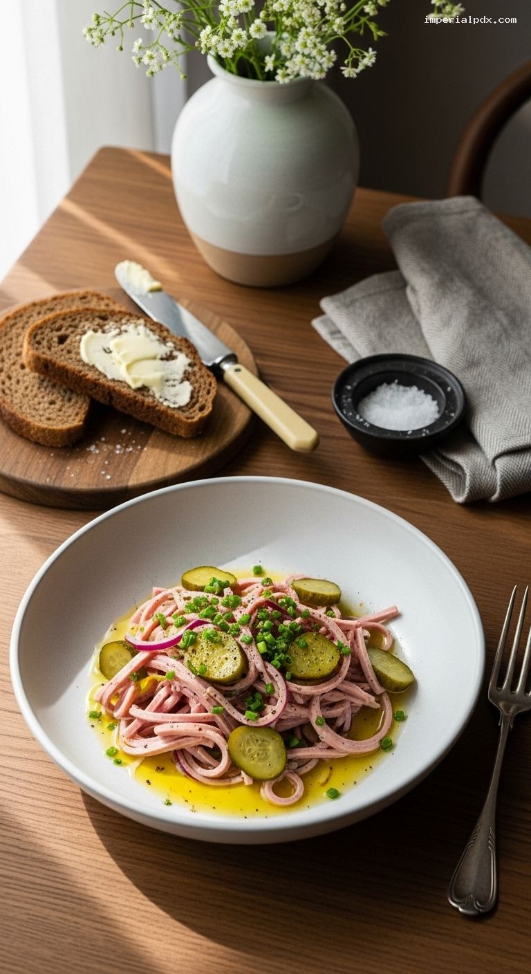 Add the julienned Lyoner, onion slivers, and pickle matchsticks to the bowl. Toss thoroughly so everything is glossed with dressing. Cover and refrigerate for 10 minutes to let flavors mingle and the onions soften slightly.