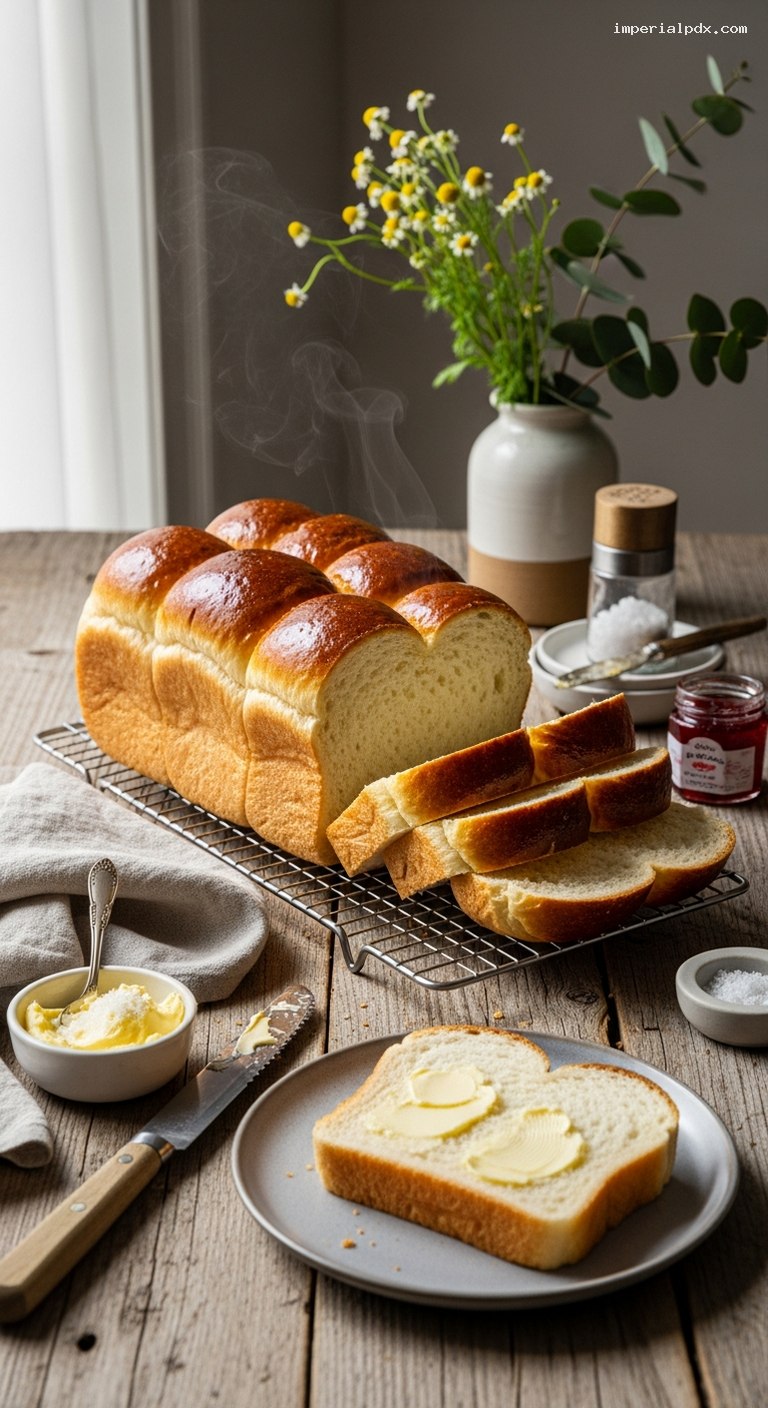 Bake at 350°F/175°C until deeply golden and the center registers 190°F/88°C, about 30 to 35 minutes. If the top browns quickly, tent with foil at the 20-minute mark. For a Pullman with lid, bake 32 to 35 minutes with the lid on. Turn the loaf out onto a wire rack immediately and cool completely for at least 2 hours before slicing to set the ultra-soft crumb.
