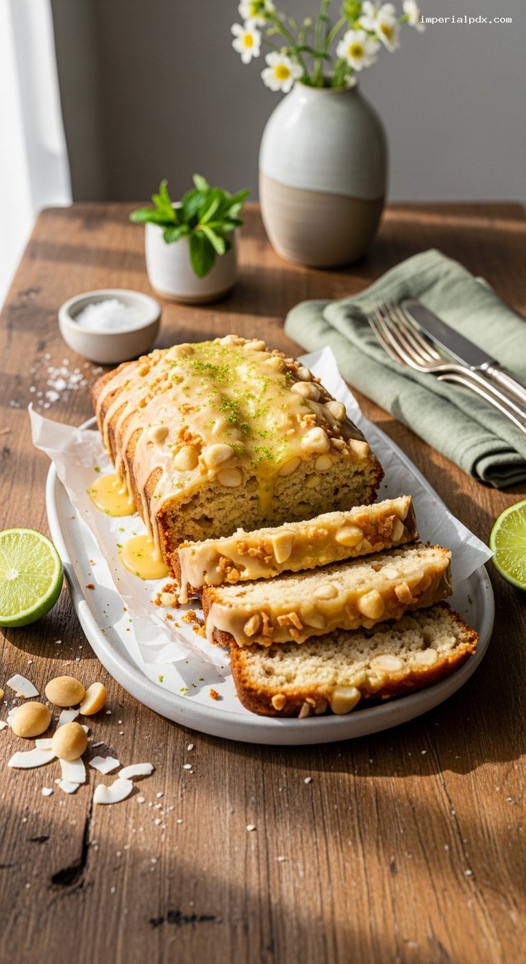 In a small bowl, whisk the powdered sugar with 2 tablespoons lime juice, coconut milk, and a pinch of salt. Add more lime juice (up to 1 more tablespoon) for a pourable ribbon consistency. Drizzle over the loaf. Sprinkle with extra lime zest and chopped macadamias. Let set 10–15 minutes, then slice.