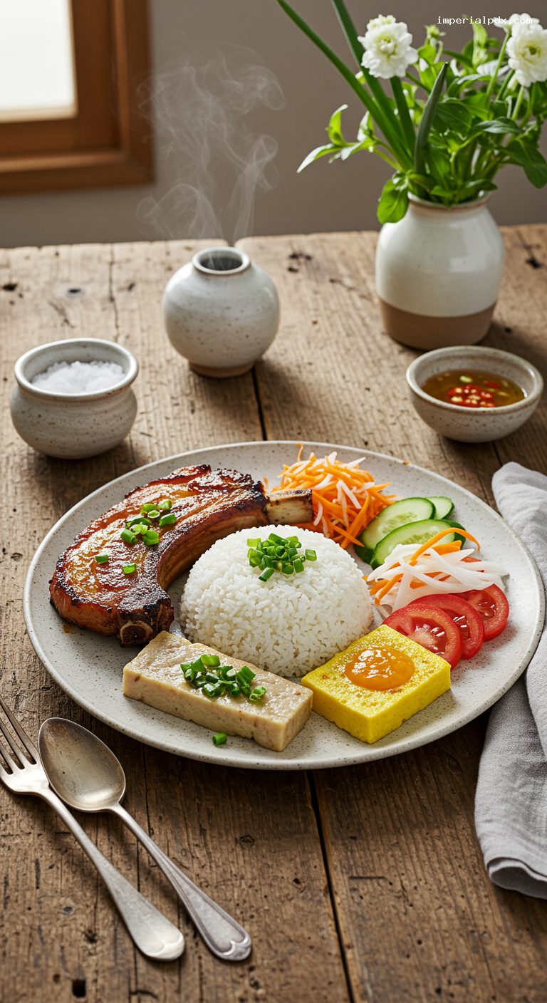 - 7. Grill chops over medium-high (450°F) 4–5 minutes per side to 145–150°F. Plate rice, pork, chả, bì, pickles; spoon scallion oil and drizzle nước chấm.