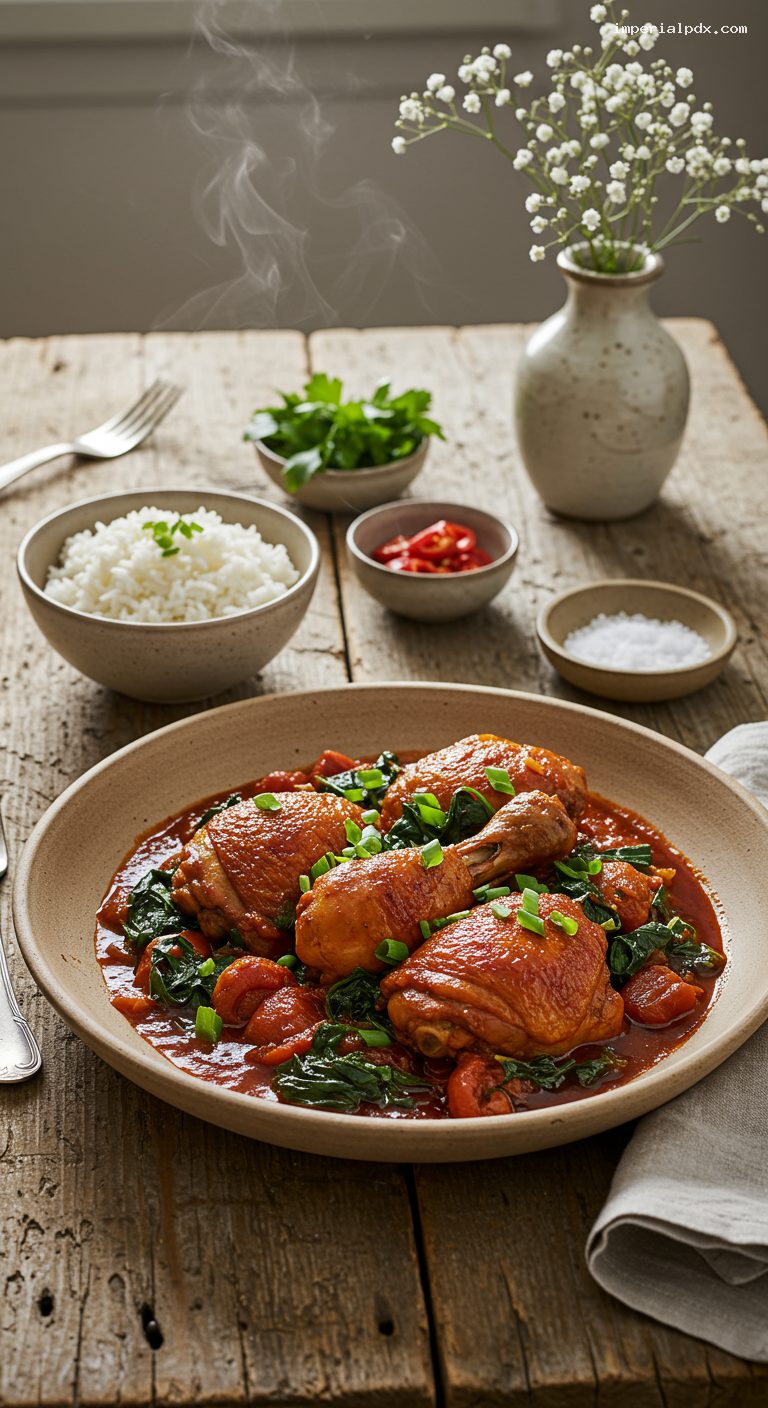 - Comforting one-pot chicken stew finished with bright, silky greens.