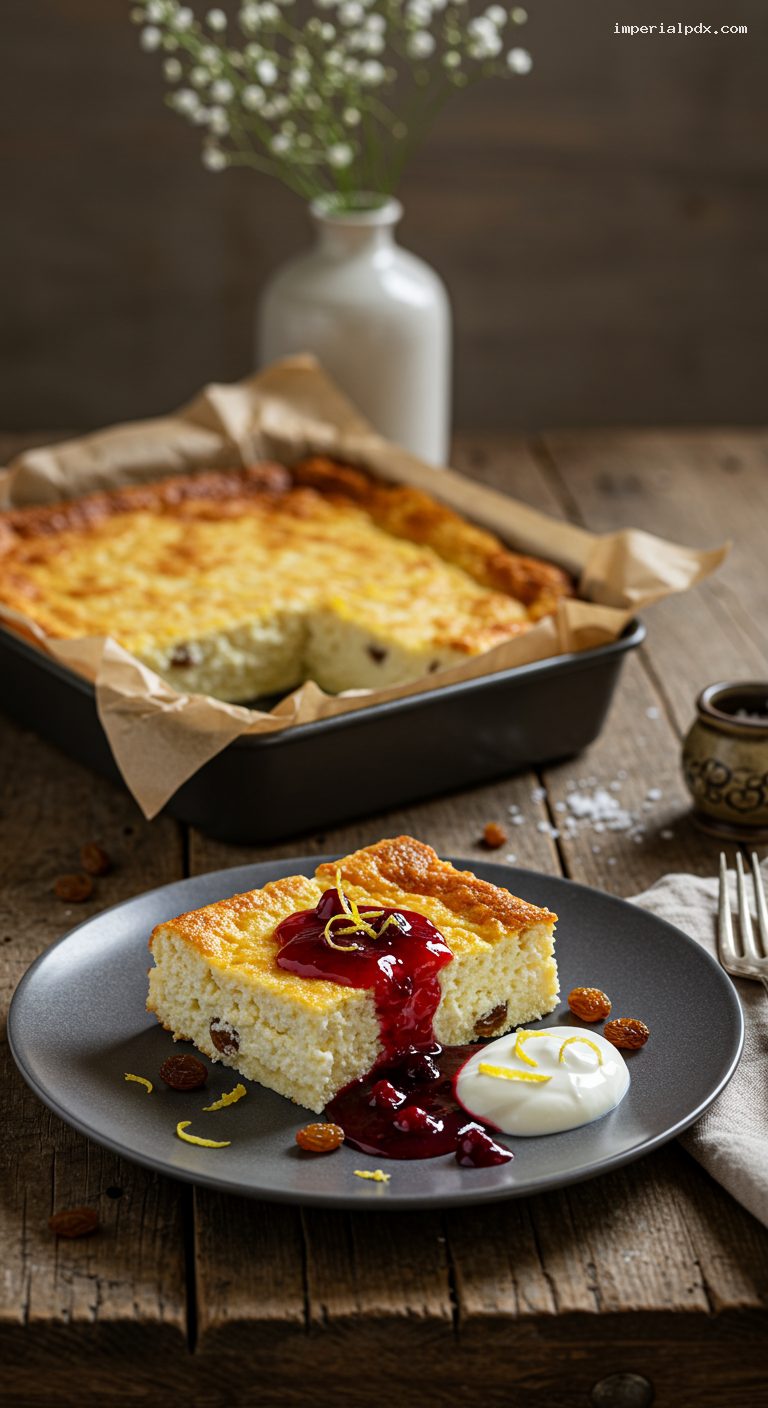 - 6) Bake 40 minutes until set and lightly golden. Cool 10–15 minutes, slice, and serve with sour cream and berry sauce.