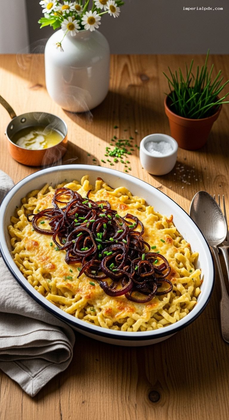 Heat the oven to 400°F (200°C). Grease a 2-qt (2 L) baking dish with 1 tbsp butter. Spread half the spätzle in the dish. Sprinkle with half the Emmental and half the Gruyère. Spoon over 2–3 tbsp caramelized onions. Repeat with remaining spätzle and cheese, reserving a handful of onions for serving.