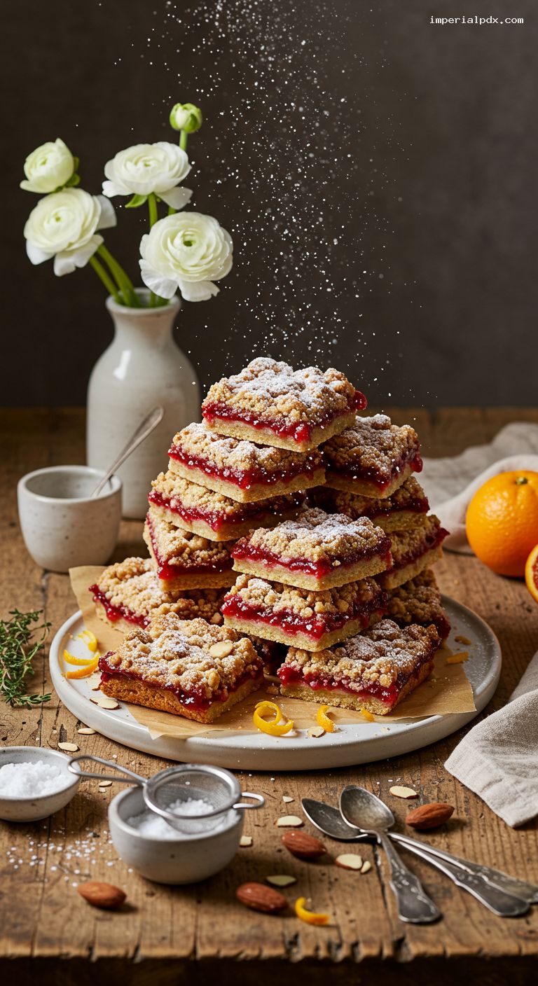 - 6) Bake 30–35 minutes until golden and jam bubbles. Cool 1 hour, chill 20 minutes, dust with powdered sugar, slice.