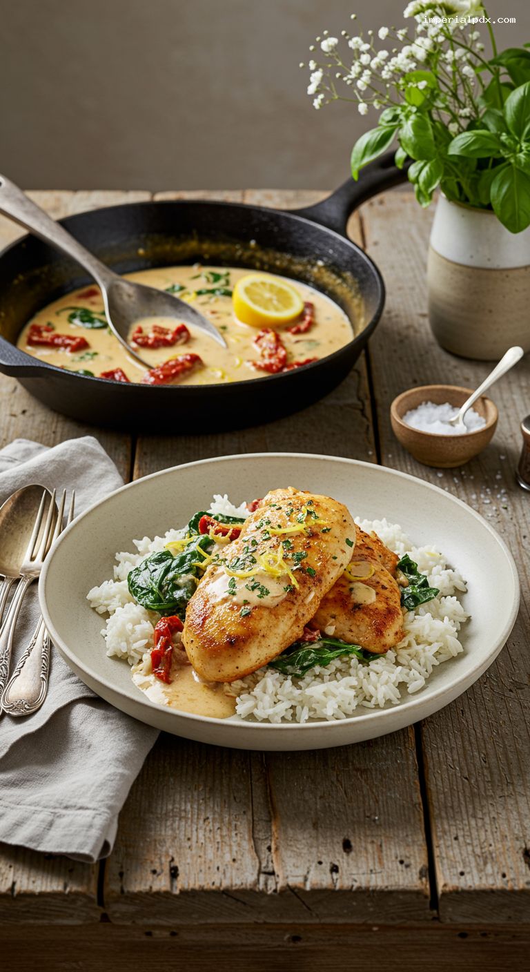 Spoon the buttered rice into warm shallow bowls or plates. Top with chicken and plenty of the creamy Tuscan sauce. Garnish with chopped parsley or basil and a little extra Parmesan. Serve immediately with extra lemon wedges if you like a brighter finish.