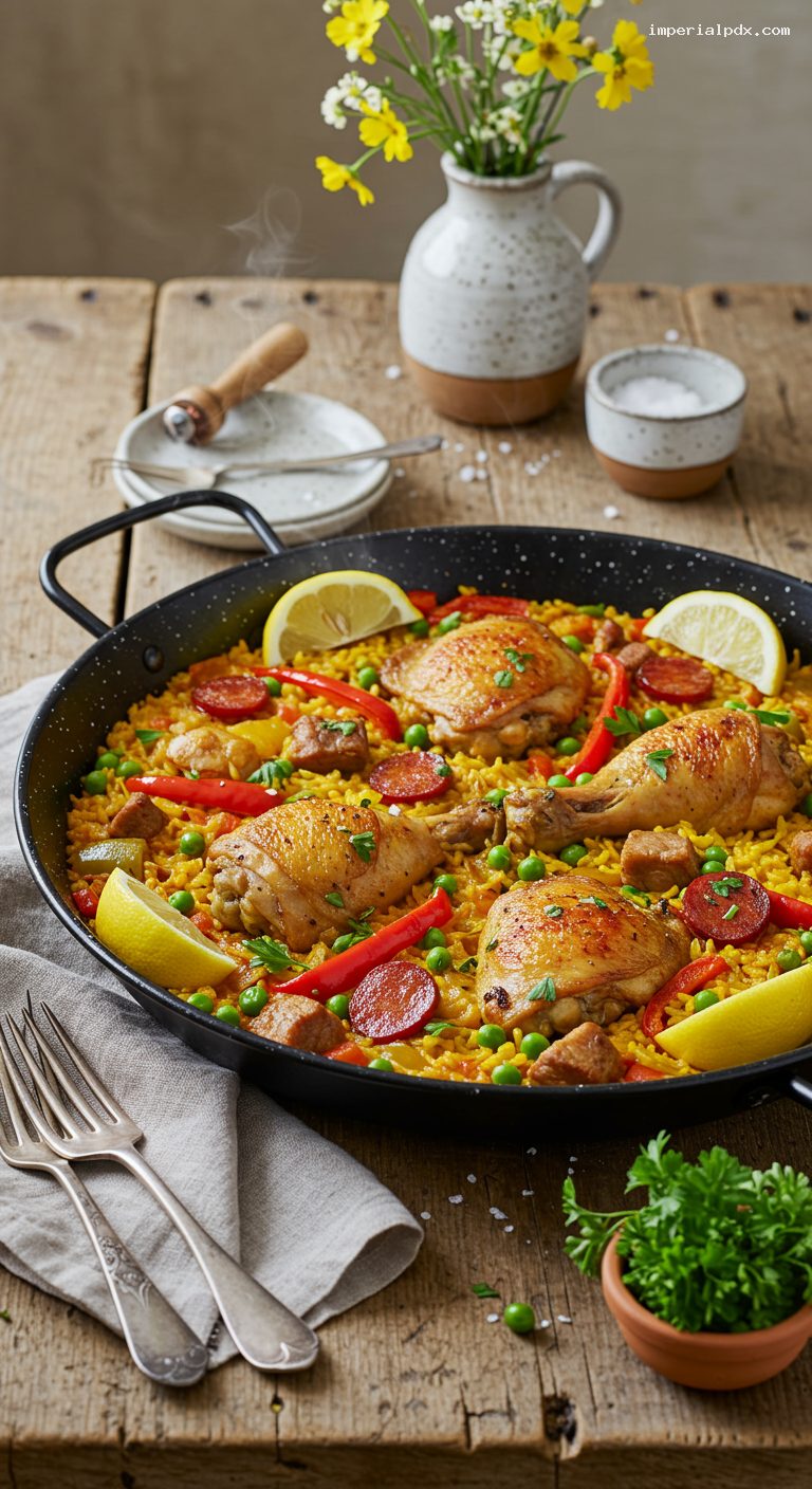 Scatter peas over the surface and tuck the chorizo slices on top. Cook 3–5 minutes more until the rice is just tender. For the prized socarrat, increase heat to medium-high for 2–3 minutes until you hear gentle crackling and smell a toasty aroma. Avoid burning. Check chicken with an instant-read thermometer near the bone; it should reach 175°F. If not, reduce heat to low and cook 2–3 minutes more, or tent and finish briefly in a 350°F oven for 5 minutes.